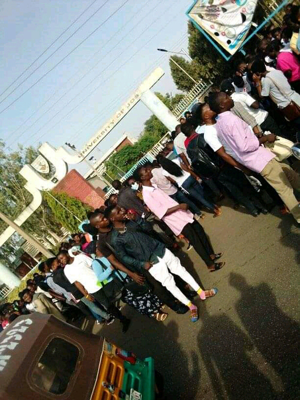 In the Early hours of Monday April 19th, 2021, The staff and students of the University Of Jos Embarked on a massive Protest of which most students and and Staff Were left stranded outside the main campus gate and permanent site gate.